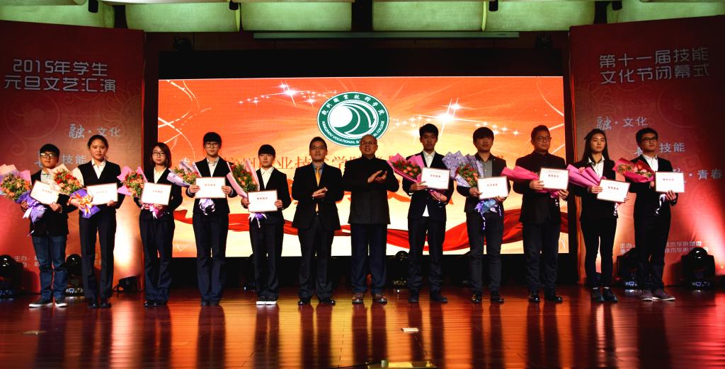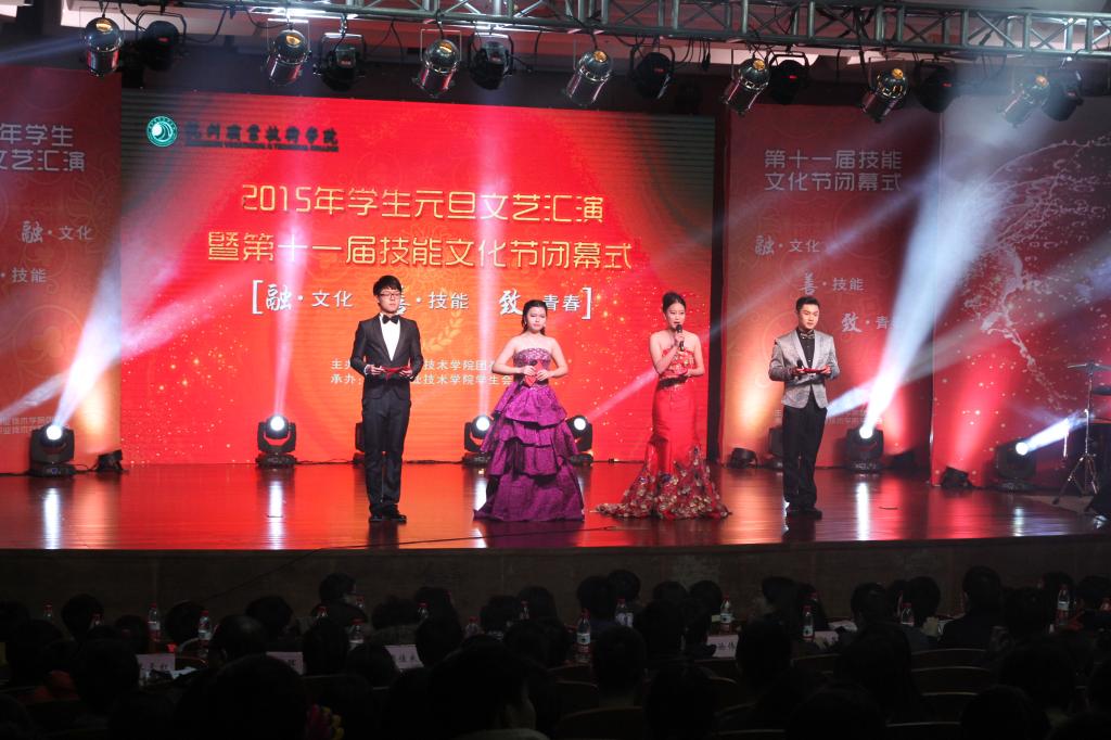 122418点,我校2015年学生元旦文艺汇演暨第十一届技能文化节闭幕式在图书馆一楼报告厅隆重举行。党委书记安蓉泉、校长贾文胜、副校长许淑燕、纪委书记陈泉淼、副校长陈加明、党委委员金徐伟出席本次晚会。此外,第十一届技能文化节组委会成员、外校嘉宾及部分在校师生也一起观赏了晚会。