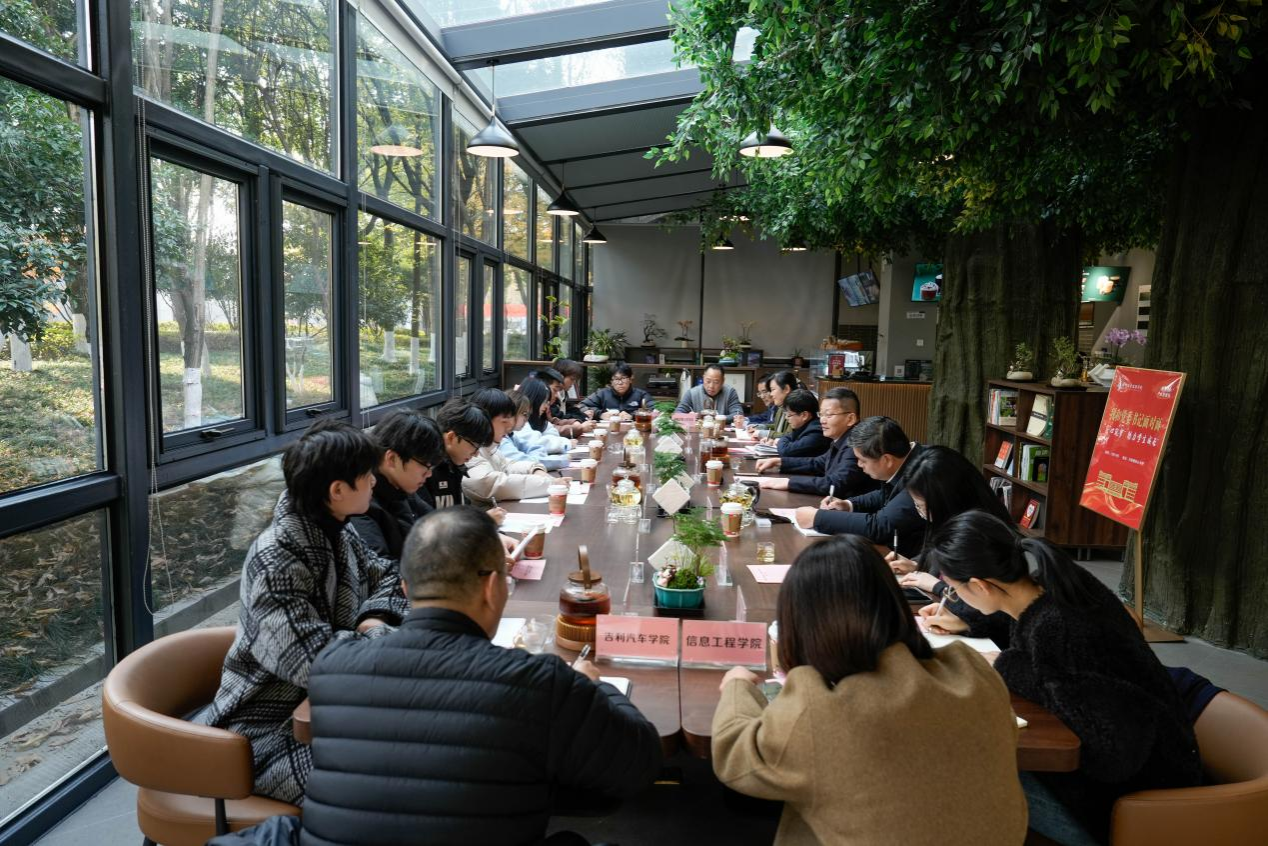 12月18日下午,校党委书记陈文岳在行政楼匠心书吧内,用一句温暖而亲切的话拉开了“匠心筑梦 助力学生成长”活动的序幕,一场关于梦想与未来的精彩对话在行政楼匠心书吧上演。校党委委员、副校长程利群;教务处、国合处、学工部、团委、后勤服务中心等相关部门负责人;友嘉、信工、吉利学院分管学生的党总支书记/副书记与电气自动化(中外合作)、运动训练(智力运动方向)、新能源汽车技术(中外合作)专业的学生代表们一起谈学习、聊想法,共话成长。