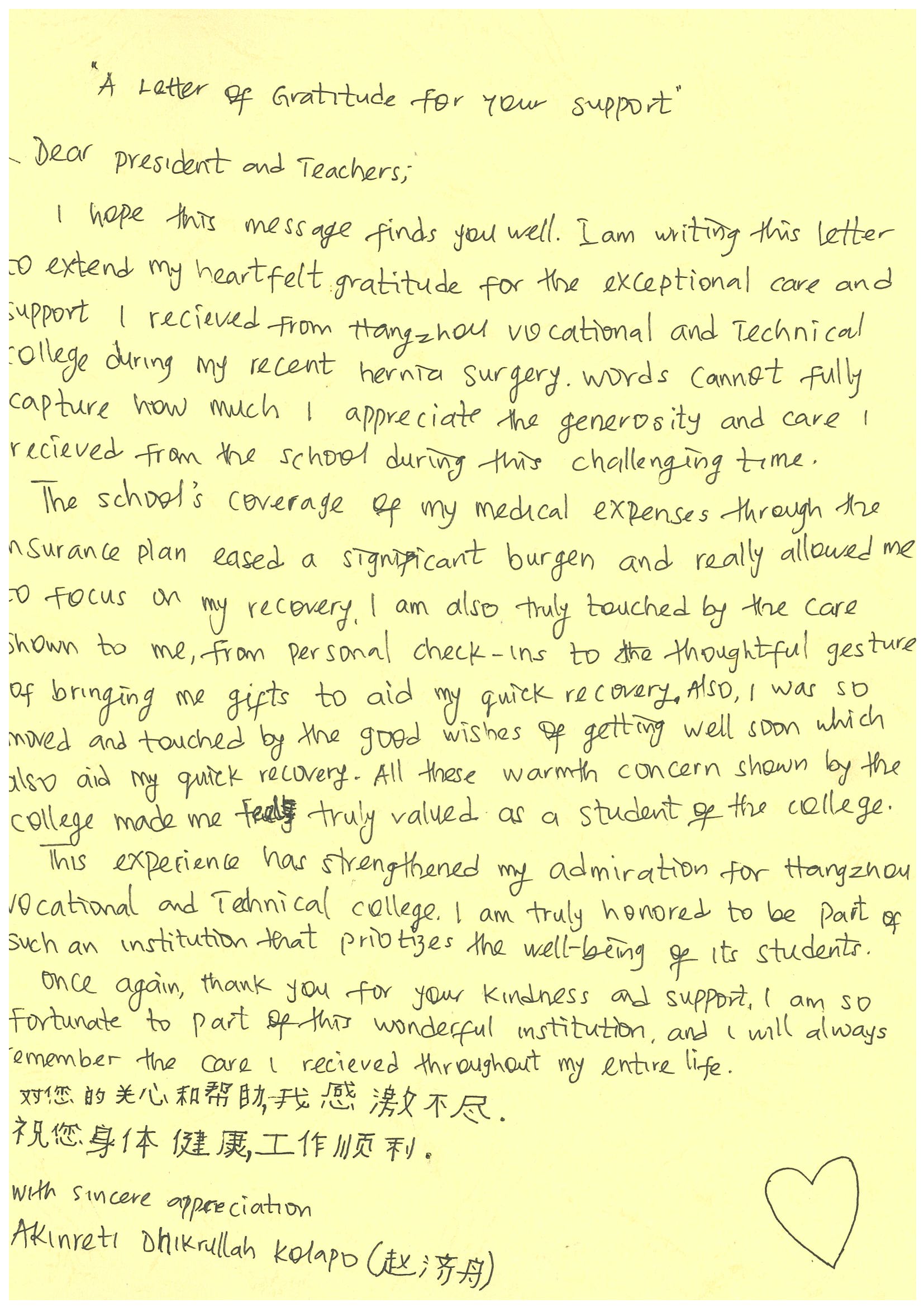 3月27日,尼日利亚学历留学生Kolapo突发急症,情况紧急,学校第一时间联系医院展开救治,经专家会诊评估,当日成功实施手术,术后情况稳定。住院期间,校长徐时清率国际处及相关部门、二级学院负责人赴院探望,详细了解治疗方案及康复进展。病愈之际,Kolapo亲笔书写感谢信,深情表达对学校关心照护的诚挚感谢。
