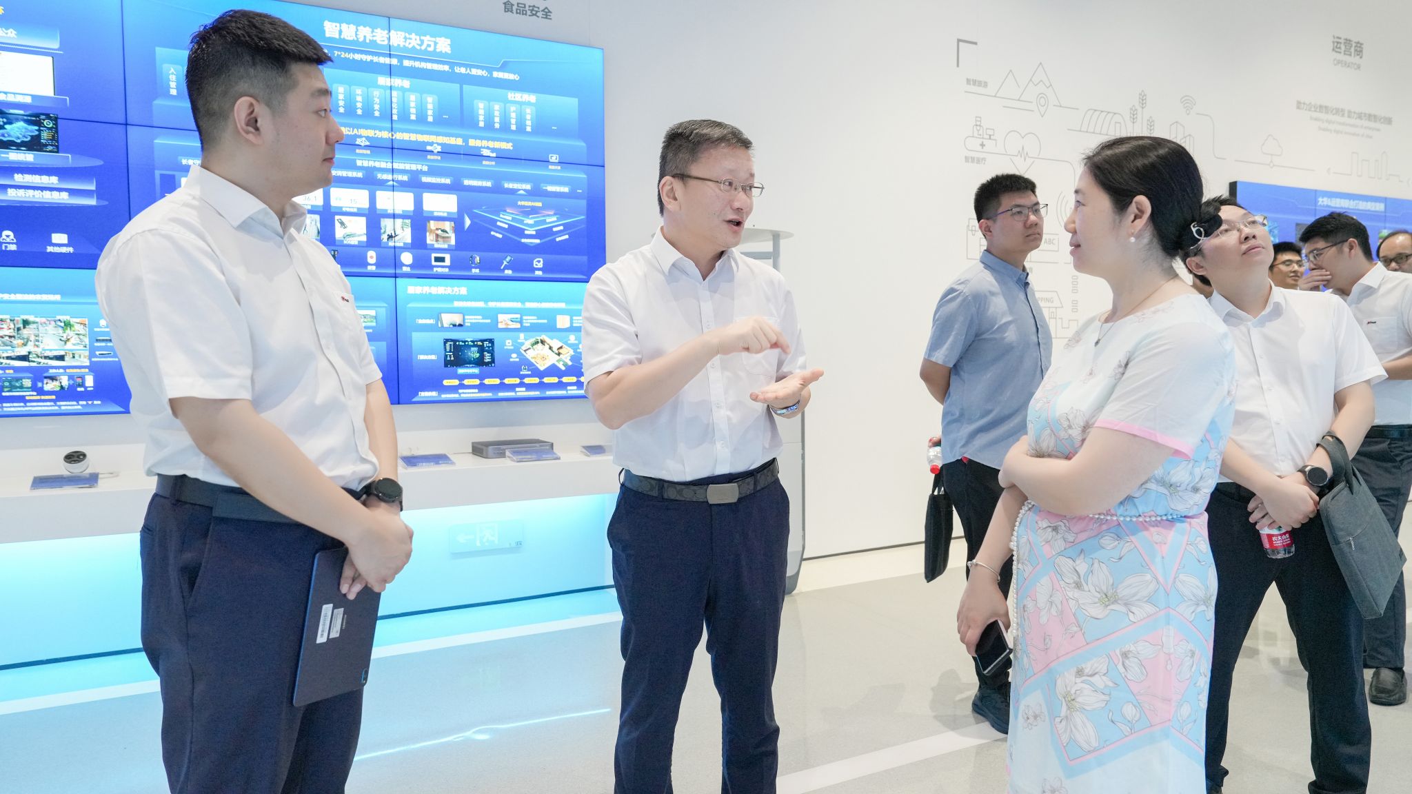 陈文岳一行实地参观了浙江大华技术股份有限公司展厅。公司相关负责人详细介绍了大华股份的发展历程,并重点展示了公司自主研发的星汉大模型在智慧教育、交通枢纽、社会治理等领域的创新应用成果。