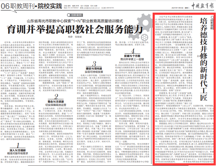 《中国教育报》刊载学校“培养德技并修的新时代工匠”